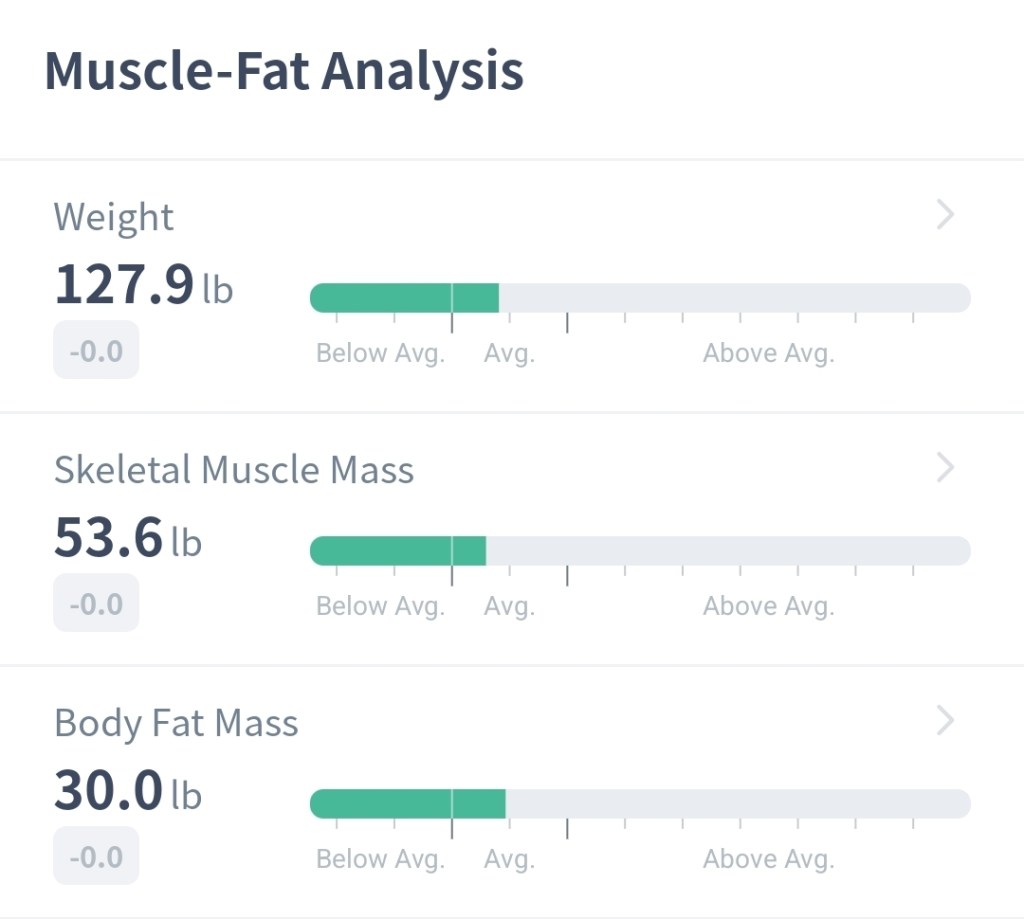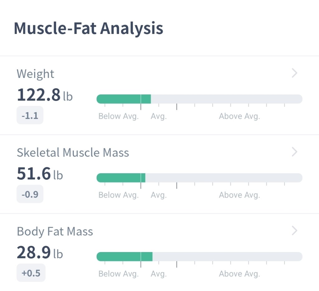 Woof! This is why I wanted to use a body composition device instead of just weighing myself. My calories were low, and yesterday I could feel the strain it was putting on my body. I still ate within my usual range of protein so I’m a bit surprised at how much muscle it says I lost.